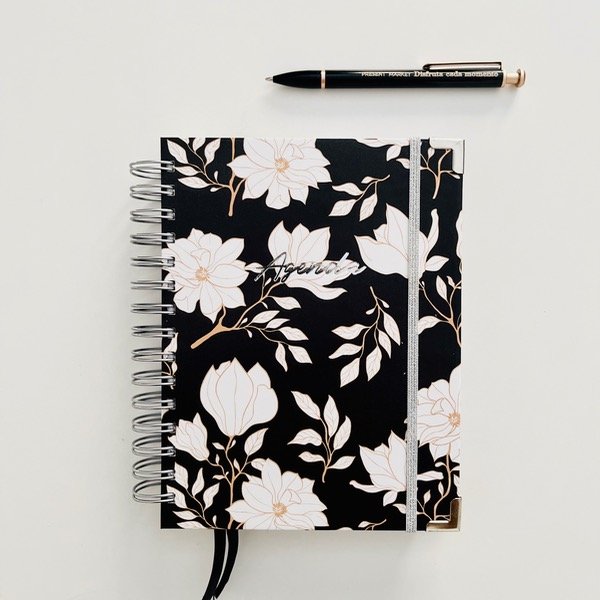 La mejor Agenda Perpetua para comenzar tu año con todo!! Con detalles de hot stamping plateado en "Agenda" Totalmente reversionada, con más espacio y planillas, cierre elástico glitter, punteras metálicas, tamaño A5 con 252 Páginas, cinta marca página doble y bolsillo interno con frase. Carátulas para cada mes con solapas separadoras.