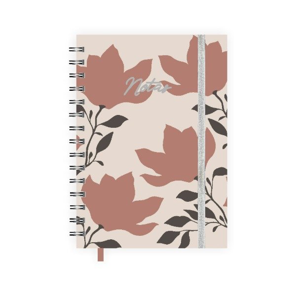 Anillado metálico plateado, tapas duras 3mm laminadas, cierre elástico con glitter y bolsillo interno con frase.
